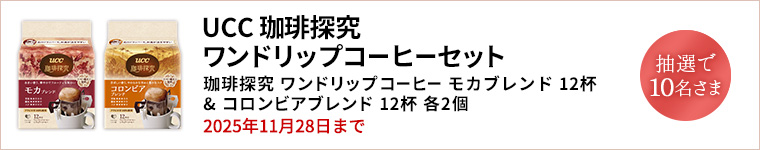 | 賞品 | ・UCC 珈琲探究 ワンドリップコーヒー モカブレンド 12杯 ×2個 ・UCC 珈琲探究 ワンドリップコーヒー コロンビアブレンド 12杯 ×2個